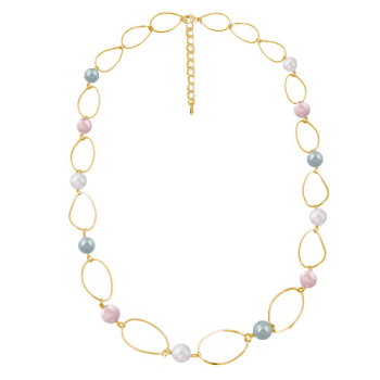 Изготовлено из ювелирного сплава на основе латуни с гальваническим покрытием золотом. Изделие украшает майорский круглый жемчуг белого, холодно-розового и голубого цвета диаметром 12мм. Длина колье 95см. Замок - карабин с удлинителем 5см.