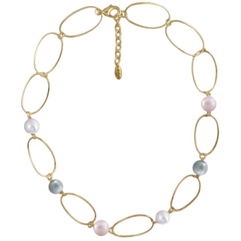 Изготовлено из ювелирного сплава на основе латуни с гальваническим покрытием золотом. Изделие украшает майорский круглый жемчуг белого, холодно-розового и голубого цвета диаметром 12мм. Длина колье 55см. Замок - карабин с удлинителем 5см.