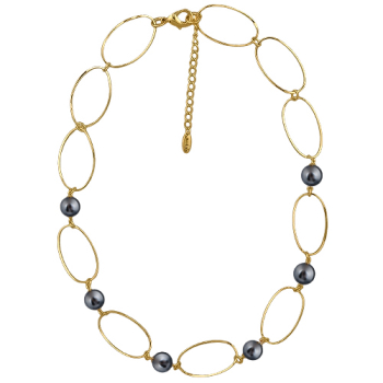 Изготовлено из ювелирного сплава на основе латуни с гальваническим покрытием золотом. Изделие украшает майорский круглый жемчуг темно-серого цвета диаметром 12мм. Длина колье 55см. Замок-карабин с удлинителем 5см.
