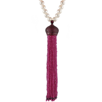 Изготовлено из ювелирного сплава на основе латуни с гальваническим покрытием черным родием. Изделие украшают белый жемчуг диаметром 5-8мм, рубиновая шпинель и фианит цвета фуксия. Длина 46см.