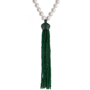 Изготовлено из ювелирного сплава на основе латуни с гальваническим покрытием черным родием. Изделие украшают белый жемчуг диаметром 5-8мм, шпинель и фианит зеленого цвета. Длина 46см.