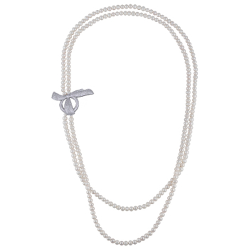 Изготовлено из ювелирного сплава на основе латуни с гальваническим покрытием родием. Изделие украшают жемчуг диаметром мм и белый фианит Длина колье 90см.