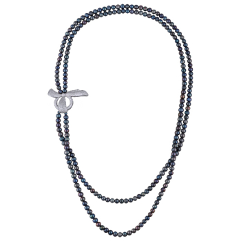 Изготовлено из ювелирного сплава на основе латуни с гальваническим покрытием родием. Изделие украшают бензиновый жемчуг диаметром мм и белый фианит Длина колье 90см.