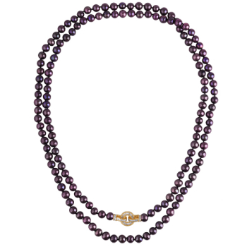 Изготовлено из ювелирного сплава на основе латуни с гальваническим покрытием золотом. Колье выполнено из натурального жемчуга высшего качества диаметром 7-8мм баклажанового цвета и украшено декоративным замком из белых фианитов. Длина 140см.