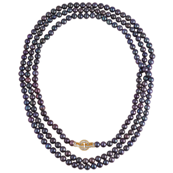 Изготовлено из ювелирного сплава на основе латуни с гальваническим покрытием золотом. Колье выполнено из натурального баклажанового жемчуга высшего качества диаметром 7-8мм и украшено декоративным замком из фианита белого цвета. Длина 200см.
