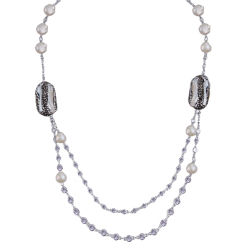 Изготовлено из ювелирного сплава на основе латуни с гальваническим покрытием родием. Изделие украшают барочный жемчуг белого цвета диаметром 30мм и кристаллы черного и белого цвета. Длина 95см.