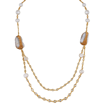 Изготовлено из ювелирного сплава на основе латуни с гальваническим покрытием золотом. Изделие украшают барочный жемчуг белого цвета диаметром 30мм и кристаллы белого и шампань цвета. Длина 95см. *Цвет и форма жемчужин может отличаться от изображенной на ф