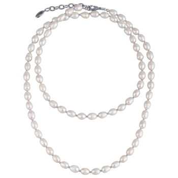 Изготовлено из ювелирного сплава на основе латуни с гальваническим покрытием родием. Изделие украшает натуральный жемчуг диаметром 6мм белого цвета. Длина 92см. Удлинитель 5см.