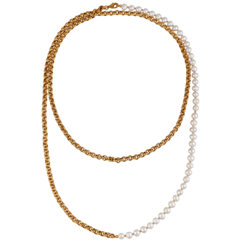 Изготовлено из ювелирного сплава на основе латуни с гальваническим покрытием золотом. Изделие украшает натуральный жемчуг диаметром 6мм белого цвета. Длина 140см.