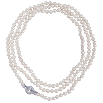 Изготовлено из ювелирного сплава на основе латуни с гальваническим покрытием родием. Колье выполнено из натурального белого жемчуга высшего качества диаметром 7-8мм и украшено декоративным замком из фианита белого цвета. Длина 140см. *Размер и форма жемчу