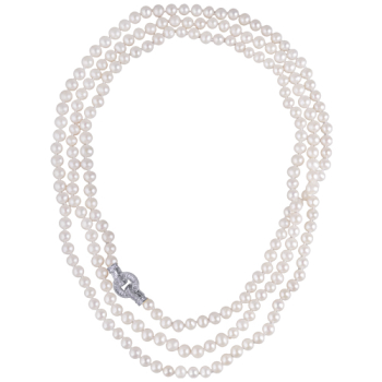 Изготовлено из ювелирного сплава на основе латуни с гальваническим покрытием родием. Колье выполнено из натурального белого жемчуга высшего качества диаметром 7-8мм и украшено декоративным замком из фианита белого цвета. Длина 160см.
