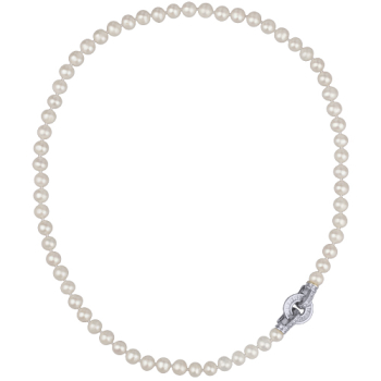 Изготовлено из ювелирного сплава на основе латуни с гальваническим покрытием родием. Колье выполнено из натурального белого жемчуга высшего качества диаметром 7-8мм и украшено декоративным замком из фианита белого цвета. Длина 50см. *Размер и форма жемчуж