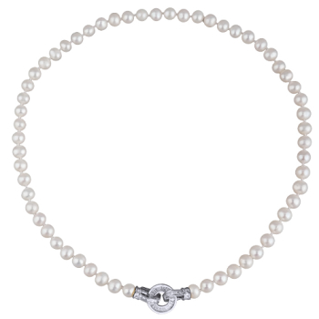 Изготовлено из ювелирного сплава на основе латуни с гальваническим покрытием родием. Колье выполнено из натурального белого жемчуга высшего качества диаметром 7-8мм и украшено декоративным замком из фианитов белого цвета. Длина 45см.