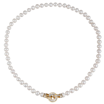 Изготовлено из ювелирного сплава на основе латуни с гальваническим покрытием золотом. Колье выполнено из натурального белого жемчуга высшего качества диаметром 7-8мм и украшено декоративным замком из фианитов белого цвета. Длина 45см.