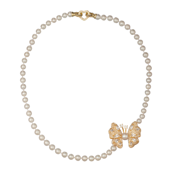Изготовлено из ювелирного сплава на основе латуни с гальваническим покрытием золотом. Изделие украшают жемчуг диаметром 7мм и белый фианит Длина колье 48см.