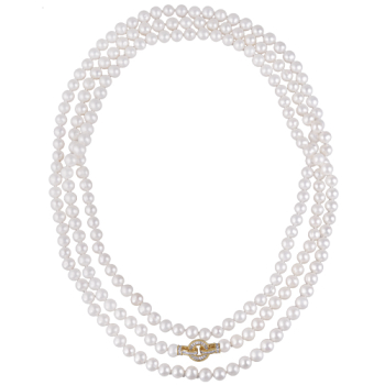 Изготовлено из ювелирного сплава на основе латуни с гальваническим покрытием золотом. Колье выполнено из натурального белого жемчуга высшего качества диаметром 8-9мм и украшено декоративным замком из фианитов белого цвета. Длина 200см.