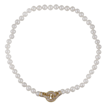Изготовлено из ювелирного сплава на основе латуни с гальваническим покрытием золотом. Колье выполнено из натурального белого жемчуга высшего качества диаметром 8-9мм и украшено декоративным замком из фианитов белого цвета. Длина 55см.