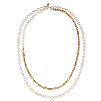 Изготовлено из ювелирного сплава на основе латуни с гальваническим покрытием золотом. Изделие украшает натуральный жемчуг диаметром 8-9мм белого цвета. Длина 140см.