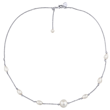 Изготовлено из ювелирного сплава на основе латуни с гальваническим покрытием родием. Изделие украшают жемчуг и белый фианит Длина 36см. Замок-карабин с удлинителем 5см.