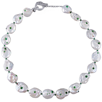 Изготовлено из ювелирного сплава на основе латуни с гальваническим покрытием родием. Изделие украшают барочный жемчуг, фианиты белого цвета и зеленые кристаллы. Длина колье 45см.