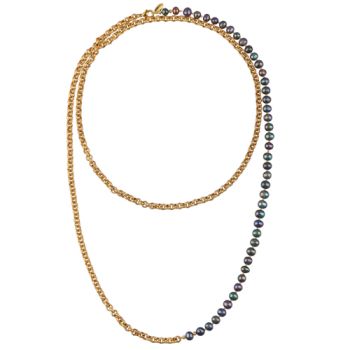 Изготовлено из ювелирного сплава на основе латуни с гальваническим покрытием золотом. Изделие украшает бензиновый жемчуг диаметром 6мм. Длина колье 140см. *Цвет и форма жемчужин может отличаться от изображенной на фото.