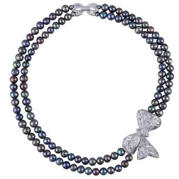 Изготовлено из ювелирного сплава на основе латуни с гальваническим покрытием родием. Изделие украшают бензиновый жемчуг диаметром 8мм и белый фианит Длина колье 45см. Размер украшения 5х4см. Складной замок-пряжка. *Цвет и форма жемчужин может отличаться о