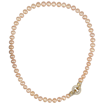 Изготовлено из ювелирного сплава на основе латуни с гальваническим покрытием золотом. Колье выполнено из натурального жемчуга высшего качества диаметром 7-8мм цвета нежный персик и украшено декоративным замком из фианитов белого цвета. Длина 45см.