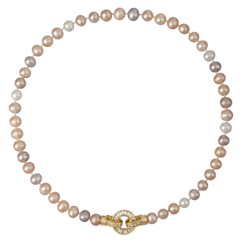 Изготовлено из ювелирного сплава на основе латуни с гальваническим покрытием золотом. Колье выполнено из натурального жемчуга высшего качества диаметром 7-8мм цвета розовый микс и украшено декоративным замком из фианитов белого цвета. Длина 40см.