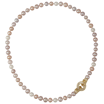 Изготовлено из ювелирного сплава на основе латуни с гальваническим покрытием золотом. Колье выполнено из натурального жемчуга высшего качества диаметром 7-8мм цвета розовый микс и украшено декоративным замком из фианитов белого цвета. Длина 45см.