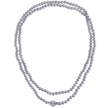 Изготовлено из ювелирного сплава на основе латуни с гальваническим покрытием родием. Колье выполнено из натурального серо-голубого жемчуга высшего качества диаметром 7-8мм и украшено декоративным замком из фианита белого цвета. Длина 140см.