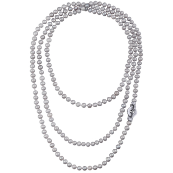 Изготовлено из ювелирного сплава на основе латуни с гальваническим покрытием родием. Колье выполнено из натурального серо-голубого жемчуга высшего качества диаметром 7-8мм и украшено декоративным замком из фианита белого цвета. Длина 160см.