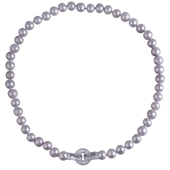 Изготовлено из ювелирного сплава на основе латуни с гальваническим покрытием родием. Колье выполнено из натурального серо-голубого жемчуга высшего качества диаметром 7-8мм и украшено декоративным замком из фианитов белого цвета. Длина 45см.