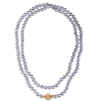 Изготовлено из ювелирного сплава на основе латуни с гальваническим покрытием золотом. Колье выполнено из натурального серо-голубого жемчуга высшего качества диаметром 8-9мм и украшено декоративным замком изфианита белого цвета. Длина 160см.