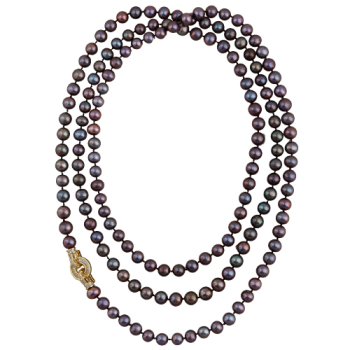Изготовлено из ювелирного сплава на основе латуни с гальваническим покрытием золотом. Колье выполнено из натурального жемчуга цвета шоколадный микс высшего качества диаметром 8-9мм и украшено декоративным замком из фианитов белого цвета. Длина 140см.*Цвет