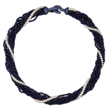 Изготовлено из ювелирного сплава на основе латуни с гальваническим покрытием черным родием. Изделие украшают белый жемчуг диаметром 5мм, шпинель и фианит синего цвета. Длина колье 50см.