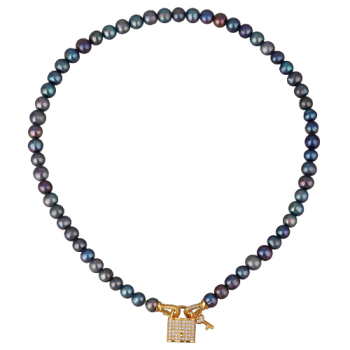 Изготовлено из ювелирного сплава на основе латуни с гальваническим покрытием золотом. Изделие украшают сине-фиолетовый жемчуг диаметром 8мм и белый фианит Длина колье 45см.