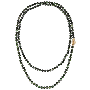 Изготовлено из ювелирного сплава на основе латуни с гальваническим покрытием золотом. Колье выполнено из натурального зеленого жемчуга высшего качества диаметром 8-9мм и украшено декоративным замком из фианитов белого цвета. Длина 140см.