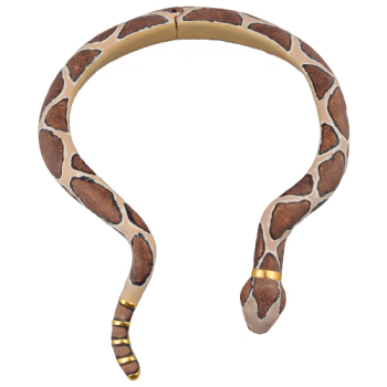 Изготовлено из ювелирного сплава на основе латуни с гальваническим покрытием золотом. Изделие украшает эмаль коричневого и бежевого цвета. Длина 50см. Установлен пружинный механизм отвода. Ширина украшения 7-20мм.