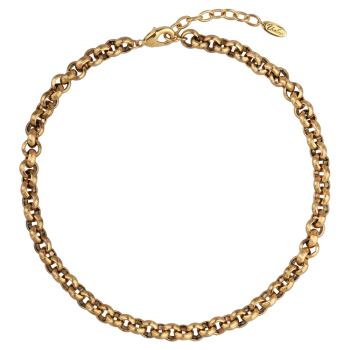 Изготовлено из ювелирного сплава на основе латуни с гальваническим покрытием античным золотом. Круглое рифленое плетение диаметром 9, 3мм. Длина 45см. Замок-карабин с удлинителем 5см.