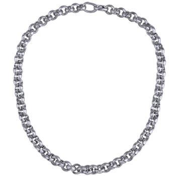 Изготовлено из ювелирного сплава на основе латуни с гальваническим покрытием палладием. Круглое рифленое плетение диаметром 9, 3мм. Длина 45см. Замок-карабин с удлинителем 5см.