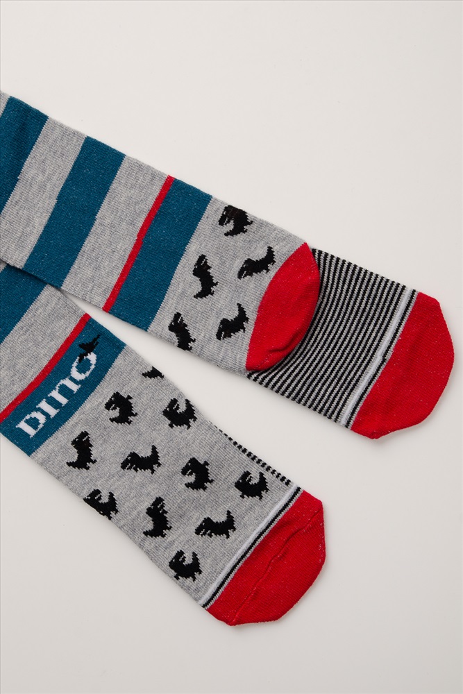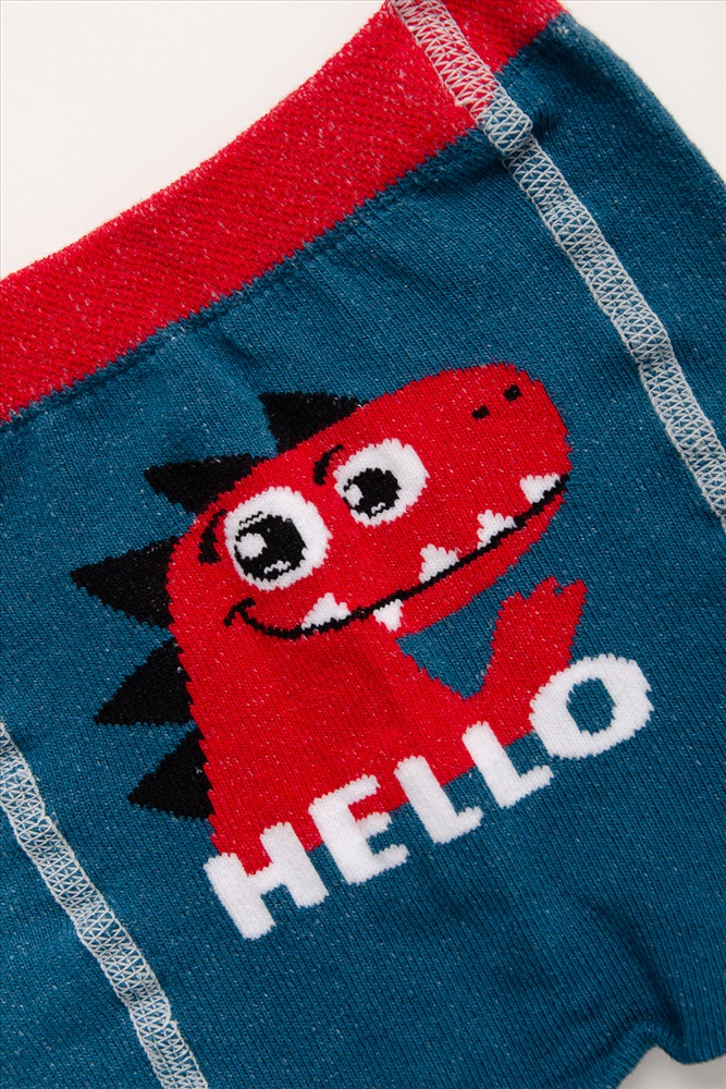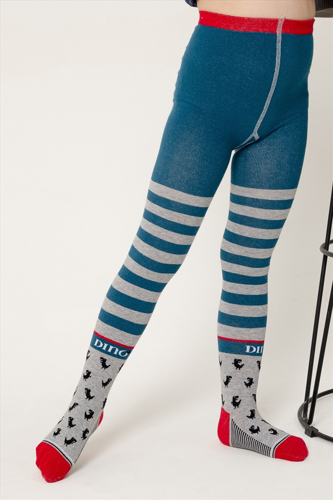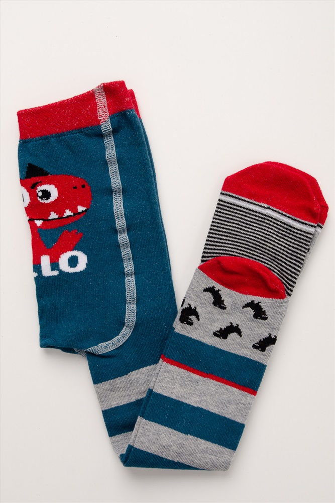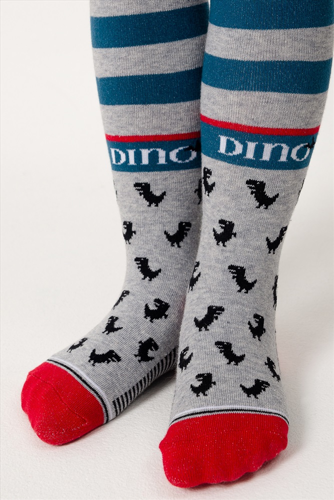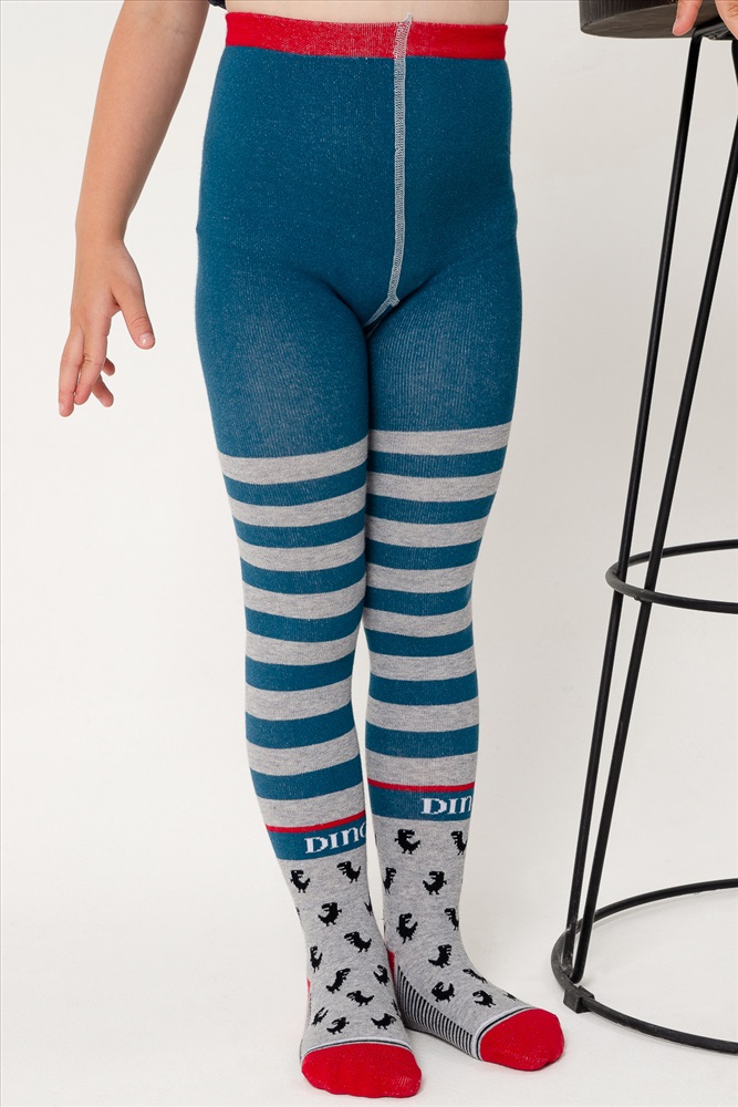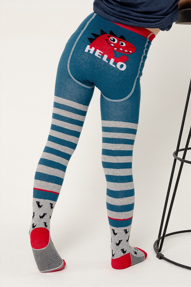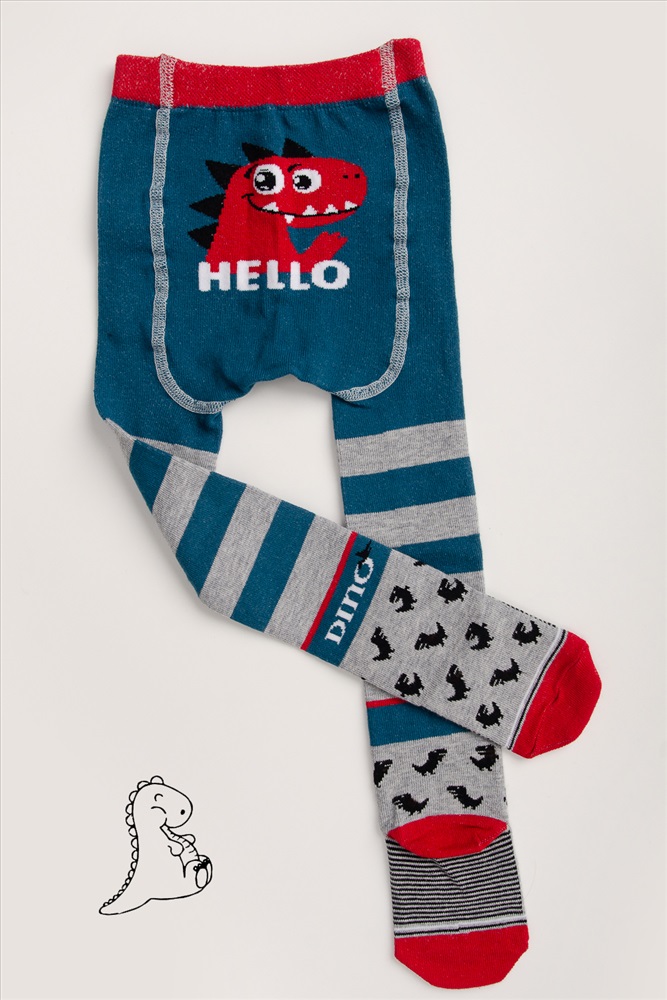 Стиль: повседневный Оригинальные детские колготки. На задней части рисунок динозаврика и надпись HELLO, на ножках рисунки динозавров и полосы.