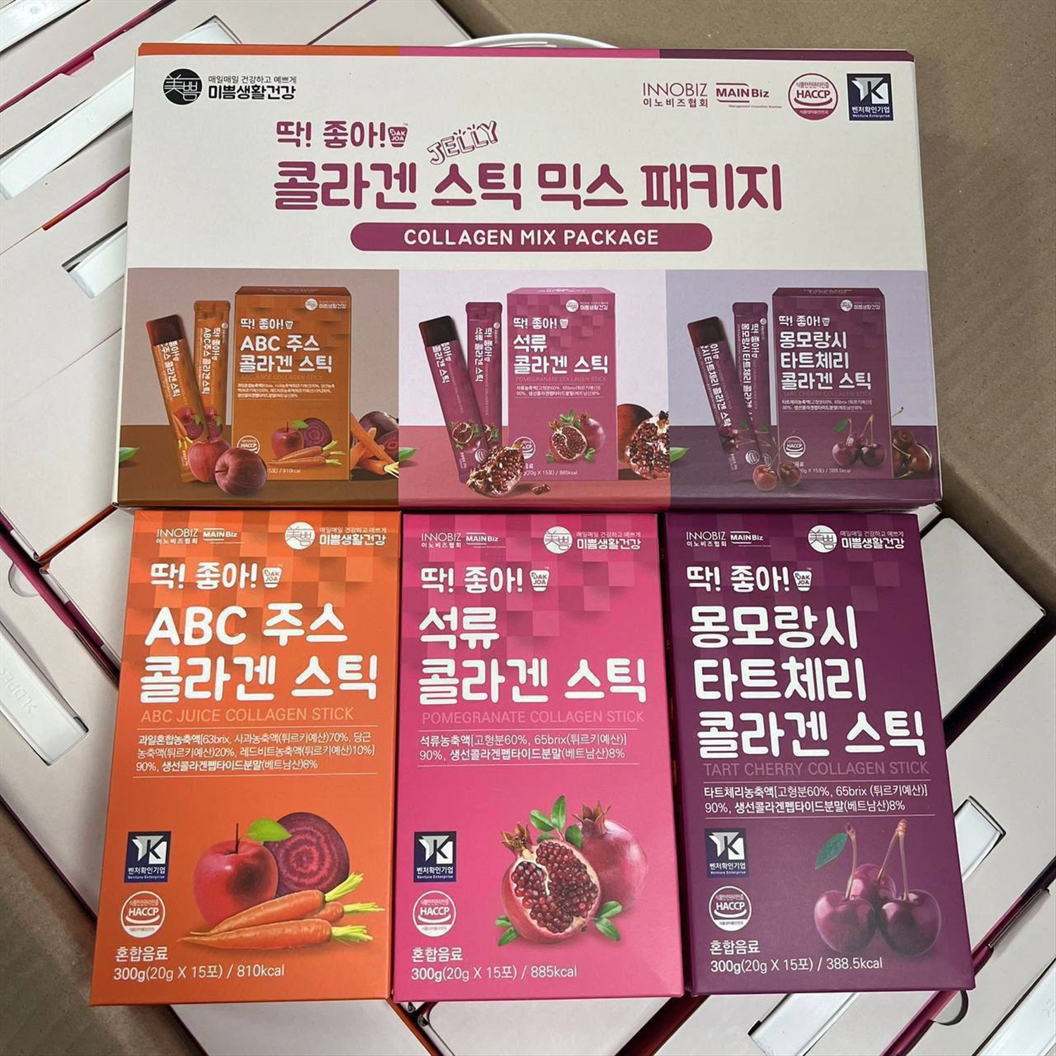 Низкомолекулярный рыбный коллаген-желе в стиках. Коллаген — гликопротеин, фибриллярный белок, составляющий основу соединительной ткани организма и обеспечивающий её прочность и эластичность. Он отвечает за работу суставов, связок и костей, а также за качество кожи. Гранат выполняет функцию антиоксиданта и обеспечивает клеткам защиту от повреждений свободными радикалами кислорода, помогает замедлить темпы старения, а также стимулирует процессы регенерации и обновления кожи. Вишня отличается высоким содержанием витамина С. Придаёт тонус, обеспечивает здоровье организма. Содержит полезные для организма микроэлементы. Сок ABC выводит токсины из организма и с его помощью восполняет недостающие питательные вещества.
