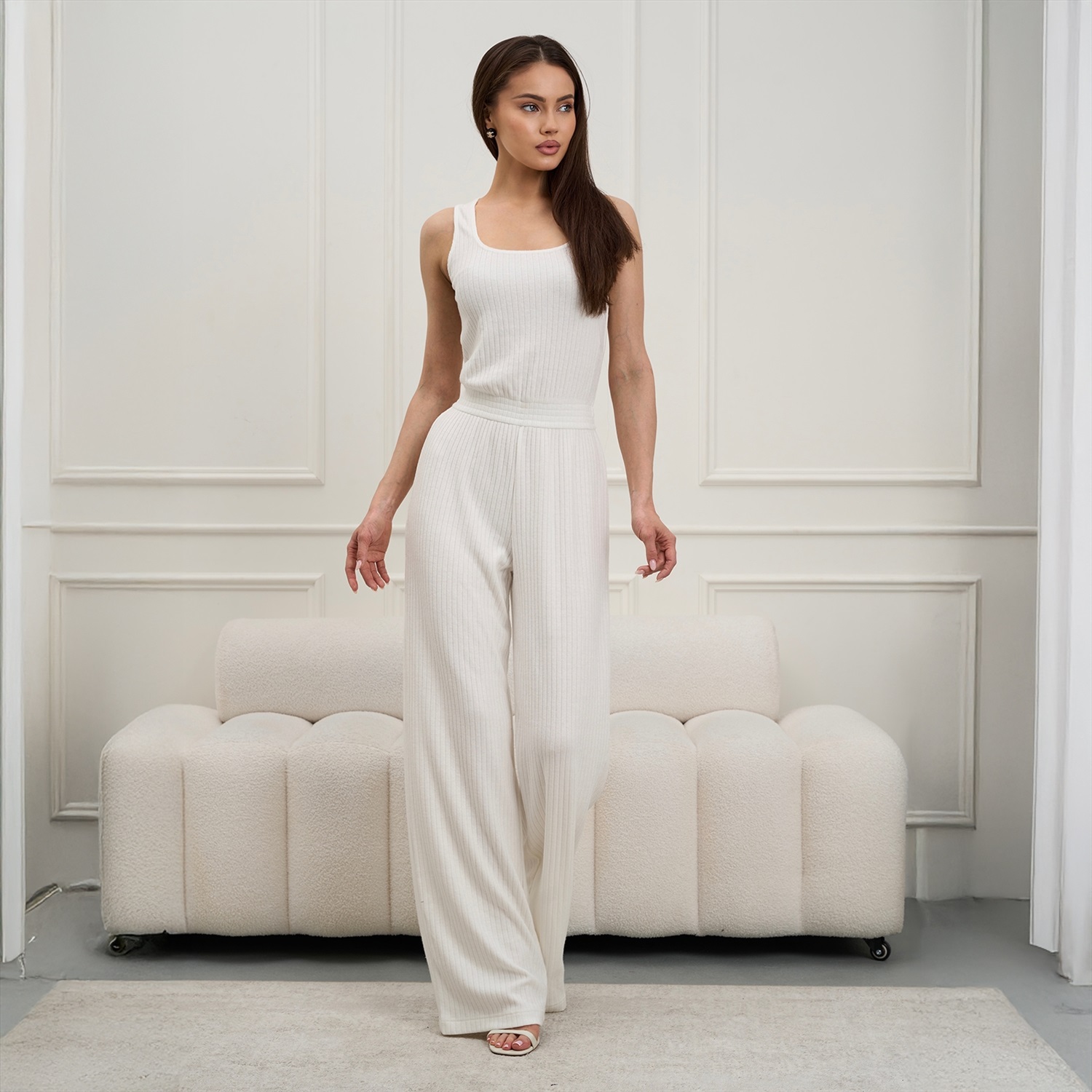 Комбинезон с брючинами прямого кроя, резинкой по линии талии и открытым верхом с вырезом "каре".Материал: Состав: 52% полиэстер, 45% вискоза, 3% лайкра.