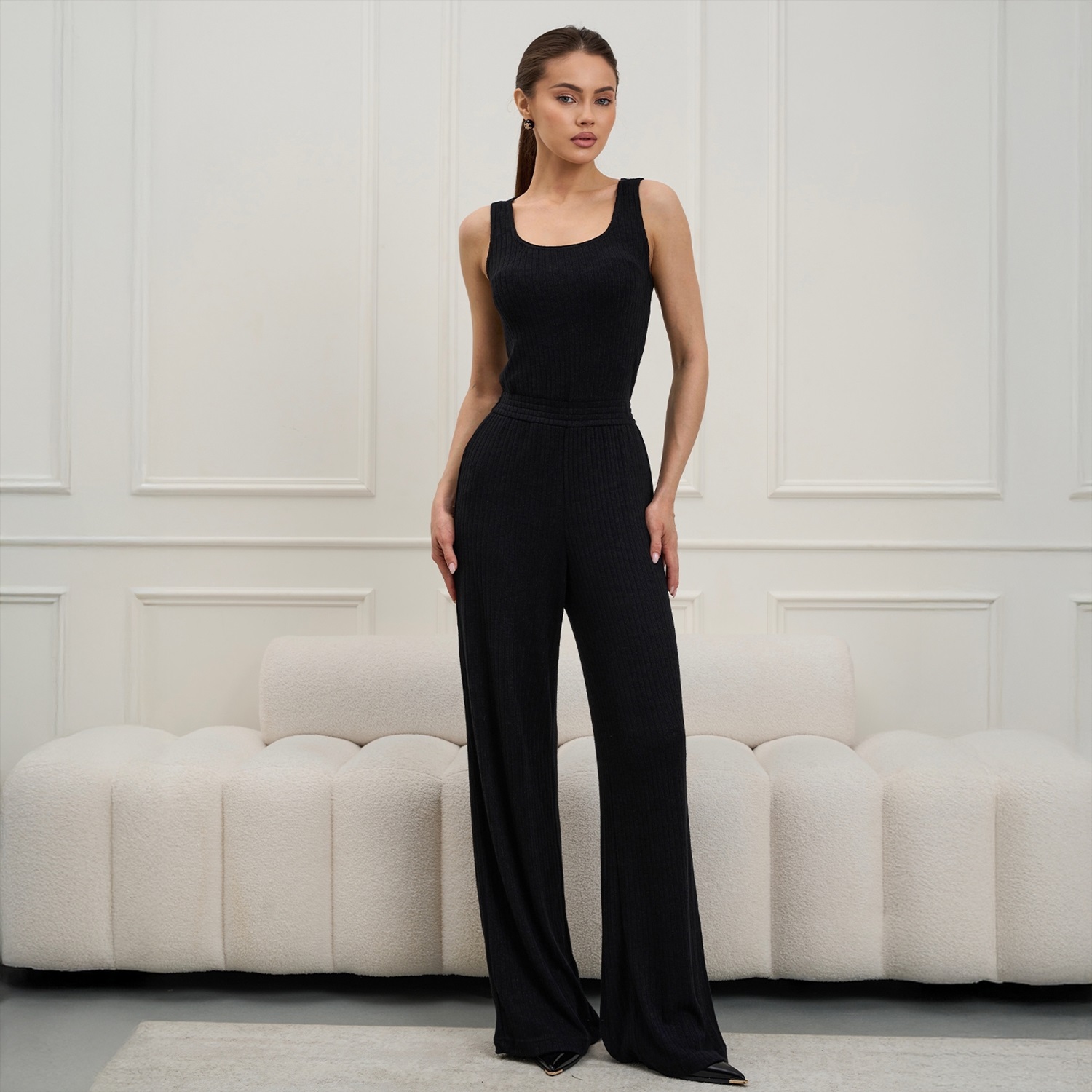 Комбинезон с брючинами прямого кроя, резинкой по линии талии и открытым верхом с вырезом "каре".Материал: Состав: 52% полиэстер, 45% вискоза, 3% лайкра.