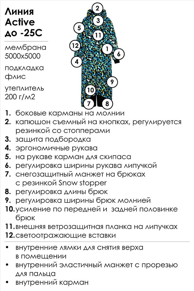 Страна производства: Китай Зимний комбинезон для девочки подростка. Особенности модели: Линия Active; Температурный режим до -25С; мембрана 5000х5000, подкладка - флис; Утеплитель 200 г/м; боковые карманы на молнии; капюшон съемный на кнопках, регулируется резинкой со стопперами; защита подбородка при застегивании молнии; эргономичные рукава; на рукаве карман для скипаса; регулировка ширины рукава липучкой; снегозащитный манжет на брюках с резинкой Snow stopper; регулировка длины брюк; регулировка ширины брюк молнией; усиление по передней и задней половинке брюк; внутренние лямки для снятия верха в помещении; внутренний эластичный манжет с прорезью для пальца; внутренний карман; внешняя ветрозащитная планка на липучках; Утепленный горнолыжный комбинезон - идеальный выбор для активного отдыха на свежем воздухе в зимний период. Инновационный утеплитель и флисовая подкладка сохраняют тепло морозную погоду. Мембранный материал делает этот яркий и модный комбинезон непромокаемым: мембрана не пропускает влагу снаружи, но выводит её изнутри, что крайне важно во время подвижных игр и занятий спортом. Легкий, теплый и удобный, комбинезон идеально подходит для спорта, лыж, сноуборда и игр на свежем воздухе в холодный период года: зима, поздняя осень и ранняя весна. *Пожалуйста, обратите внимание, что указанный температурный режим является приблизительным и зависит от многих факторов, таких как возраст, физическое состояние, уровень активности ребенка и количество слоев одежды. Время, проведенное на открытом воздухе, и погодные условия, такие как холодный ветер, могут повлиять на тепловые характеристики изделия. Убедитесь, что защищены от холода голова, руки и ноги.
