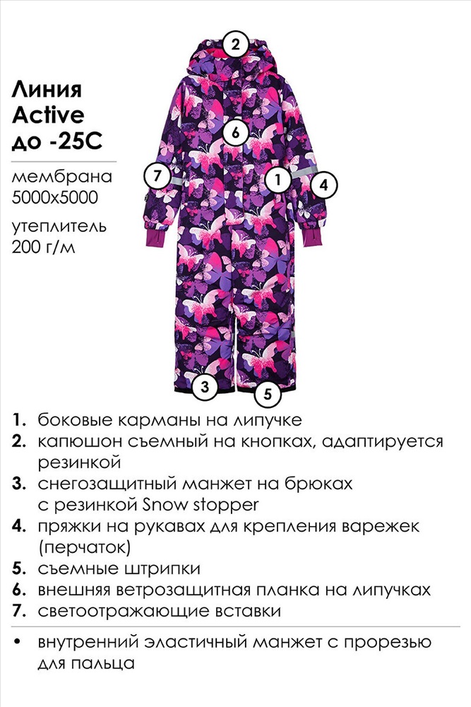 Страна производства: Китай Зимний детский комбинезон для девочки. Особенности модели: Линия Active; Температурный режим до -25С; мембрана 5000х5000 Утеплитель 200 г/м; боковые карманы на липучке; капюшон съемный на кнопках, адаптируется резинкой; снегозащитный манжет на брюках с резинкой Snow stopper; внутренний эластичный манжет с прорезью для пальца; пряжки на рукавах для крепления варежек (перчаток); съемные штрипки; внешняя ветрозащитная планка на липучках; Детский утепленный горнолыжный комбинезон - идеальный выбор для активного отдыха на свежем воздухе в зимний период. Инновационный утеплитель и флисовая подкладка сохраняют тепло морозную погоду. Мембранный материал делает этот яркий и модный комбинезон непромокаемым: мембрана не пропускает влагу снаружи, но выводит её изнутри, что крайне важно во время подвижных игр и занятий спортом. Легкий, теплый и удобный, комбинезон идеально подходит для спорта, лыж, сноуборда и игр на свежем воздухе в холодный период года: зима, поздняя осень и ранняя весна. *Пожалуйста, обратите внимание, что указанный температурный режим является приблизительным и зависит от многих факторов, таких как возраст, физическое состояние, уровень активности ребенка и количество слоев одежды. Время, проведенное на открытом воздухе, и погодные условия, такие как холодный ветер, могут повлиять на тепловые характеристики изделия. Убедитесь, что защищены от холода голова, руки и ноги.