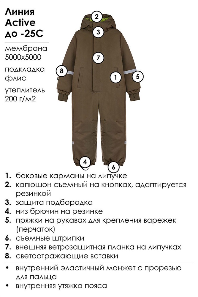 Зимний детский комбинезон для мальчика. Особенности модели: Линия Active; Температурный режим до -25С; мембрана 5000х5000, подкладка - флис; Утеплитель 200 г/м; боковые карманы на липучке; капюшон съемный на кнопках, адаптируется резинкой; защита подбородка при застегивании молнии; низ брючин на резинке; внутренний эластичный манжет с прорезью для пальца; внутренняя утяжка пояса; пряжки на рукавах для крепления варежек (перчаток); съемные штрипки; внешняя ветрозащитная планка на липучках; Детский утепленный горнолыжный комбинезон - идеальный выбор для активного отдыха на свежем воздухе в зимний период. Инновационный утеплитель и флисовая подкладка сохраняют тепло морозную погоду. Мембранный материал делает этот яркий и модный комбинезон непромокаемым: мембрана не пропускает влагу снаружи, но выводит её изнутри, что крайне важно во время подвижных игр и занятий спортом. Легкий, теплый и удобный, комбинезон идеально подходит для спорта, лыж, сноуборда и игр на свежем воздухе в холодный период года: зима, поздняя осень и ранняя весна. *Пожалуйста, обратите внимание, что указанный температурный режим является приблизительным и зависит от многих факторов, таких как возраст, физическое состояние, уровень активности ребенка и количество слоев одежды. Время, проведенное на открытом воздухе, и погодные условия, такие как холодный ветер, могут повлиять на тепловые характеристики изделия. Убедитесь, что защищены от холода голова, руки и ноги.