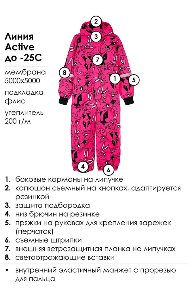 Страна производства: Китай Зимний детский комбинезон для девочки. Особенности модели: Линия Active; Температурный режим до -25С; мембрана 5000х5000, подкладка - флис; Утеплитель 200 г/м; боковые карманы на липучке; капюшон съемный на кнопках, адаптируется резинкой; защита подбородка при застегивании молнии; низ брючин на резинке; внутренний эластичный манжет с прорезью для пальца; пряжки на рукавах для крепления варежек (перчаток); съемные штрипки; внешняя ветрозащитная планка на липучках; Детский утепленный горнолыжный комбинезон - идеальный выбор для активного отдыха на свежем воздухе в зимний период. Инновационный утеплитель и флисовая подкладка сохраняют тепло морозную погоду. Мембранный материал делает этот яркий и модный комбинезон непромокаемым: мембрана не пропускает влагу снаружи, но выводит её изнутри, что крайне важно во время подвижных игр и занятий спортом. Легкий, теплый и удобный, комбинезон идеально подходит для спорта, лыж, сноуборда и игр на свежем воздухе в холодный период года: зима, поздняя осень и ранняя весна. *Пожалуйста, обратите внимание, что указанный температурный режим является приблизительным и зависит от многих факторов, таких как возраст, физическое состояние, уровень активности ребенка и количество слоев одежды. Время, проведенное на открытом воздухе, и погодные условия, такие как холодный ветер, могут повлиять на тепловые характеристики изделия. Убедитесь, что защищены от холода голова, руки и ноги.