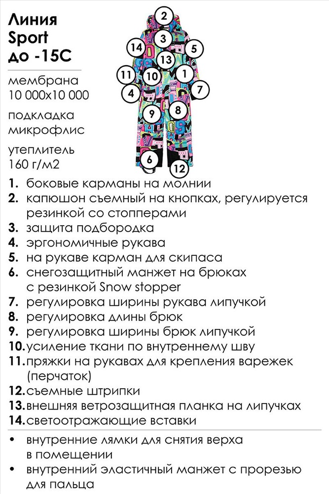 ID товара: 1064610 Состав: Верх- 100% Полиэстер; Мембранное покрытие 10 000*10 000; Подкладка- микрофлис, 100% Полиэстер; Утеплитель- 160 г/м2 Сезон: Осень/Зима Длина: Полная Фасон: Прямой Рукав: длинные Вид застежки: Молния Рисунок: Фантазийный Тип карманов: Прорезные Декоративные элементы: С капюшоном Утеплитель: с утеплителем, 160 г/м2 Стиль: повседневный Реком. темп. режим: до -15ºС Страна бренда: Германия Страна производства: Китай Зимний детский комбинезон для девочки. Особенности модели: Линия Sport; Температурный режим до -15С; мембрана 10 000х10 000; Утеплитель 160 г/м2; подкладка - микрофлис; внутренние лямки для снятия верха в помещении; боковые карманы на молнии; капюшон съемный на кнопках, регулируется резинкой со стопперами; защита подбородка; эргономичные рукава; на рукаве карман для скипаса; снегозащитный манжет на брюках с резинкой Snow stopper; регулировка ширины рукава липучкой; регулировка длины брюк; регулировка ширины брюк липучкой; усиление ткани по внутреннему шву; внутренний эластичный манжет с прорезью для пальца; пряжки на рукавах для крепления варежек (перчаток); съемные штрипки; внешняя ветрозащитная планка на липучках; светоотражающие вставки; Утепленный горнолыжный комбинезон - идеальный выбор для активного отдыха на свежем воздухе в зимний период. Инновационный утеплитель и флисовая подкладка сохраняют тепло морозную погоду. Мембранный материал делает этот яркий и модный комбинезон непромокаемым: мембрана не пропускает влагу снаружи, но выводит её изнутри, что крайне важно во время подвижных игр и занятий спортом. Легкий, теплый и удобный, комбинезон идеально подходит для спорта, лыж, сноуборда и игр на свежем воздухе в холодный период года: зима, поздняя осень и ранняя весна. *Пожалуйста, обратите внимание, что указанный температурный режим является приблизительным и зависит от многих факторов, таких как возраст, физическое состояние, уровень активности ребенка и количество слоев одежды. Время, проведенное на открытом воздухе, и погодные условия, такие как холодный ветер, могут повлиять на тепловые характеристики изделия. Убедитесь, что защищены от холода голова, руки и ноги. Комментарии к товару