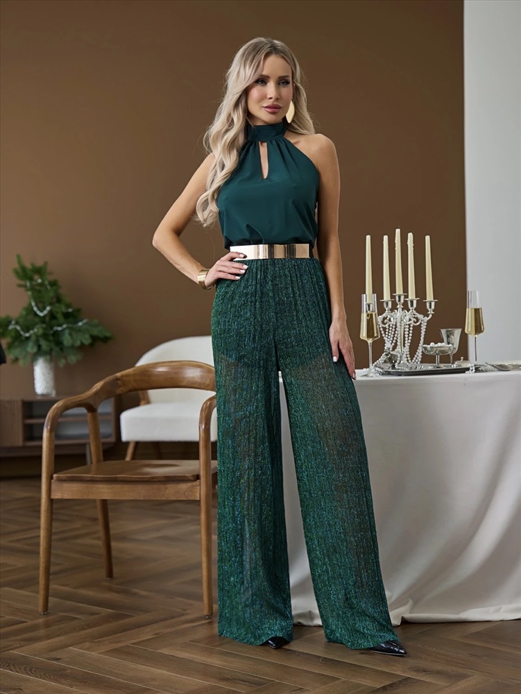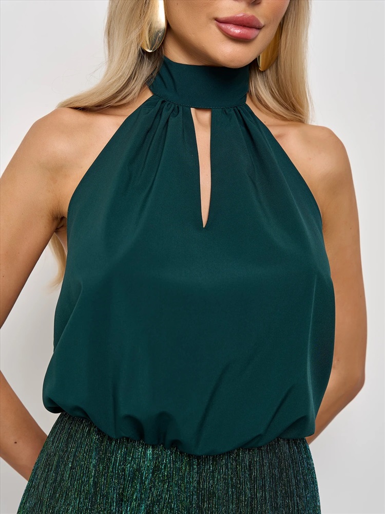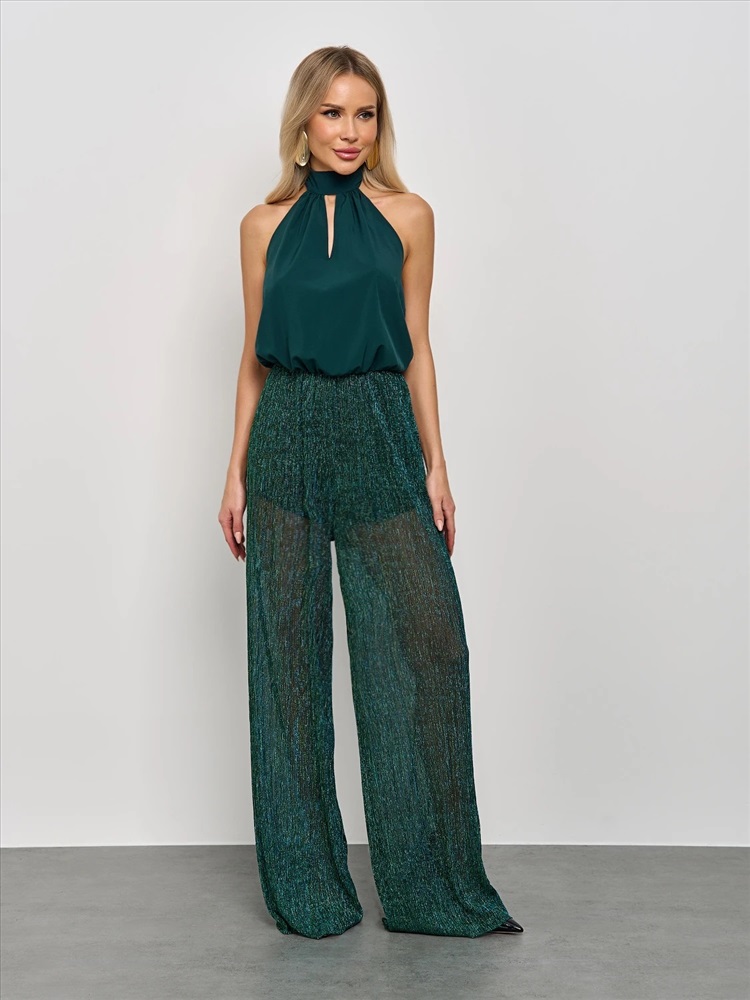 Низ комбинезона выполнен из жатого шифона с люрексом и дополнен подкладом-шортами.